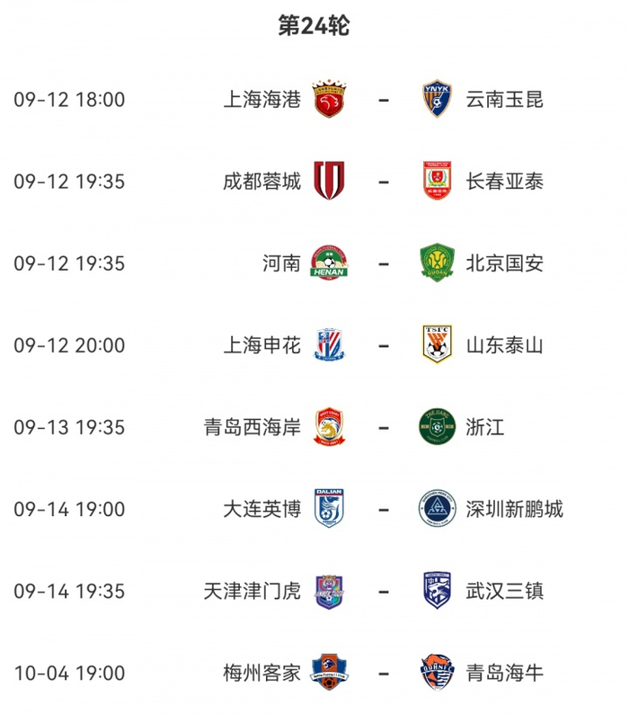 直播吧09月12日讯 中超重燃战火,前4球队今天纷纷出战,蓉城对阵倒数第一但进来状态不俗的亚泰,近5轮只拿到1胜的申花大战4连胜的泰山,海港主场迎战客场战绩糟糕的玉昆,国安客场挑战河南。