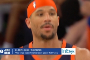 目前,约什-哈特已经得到了13分11篮板10助攻,这是他个人本赛季第9次三双,超越沃尔特-弗雷泽,创尼克斯单赛季三双纪录。